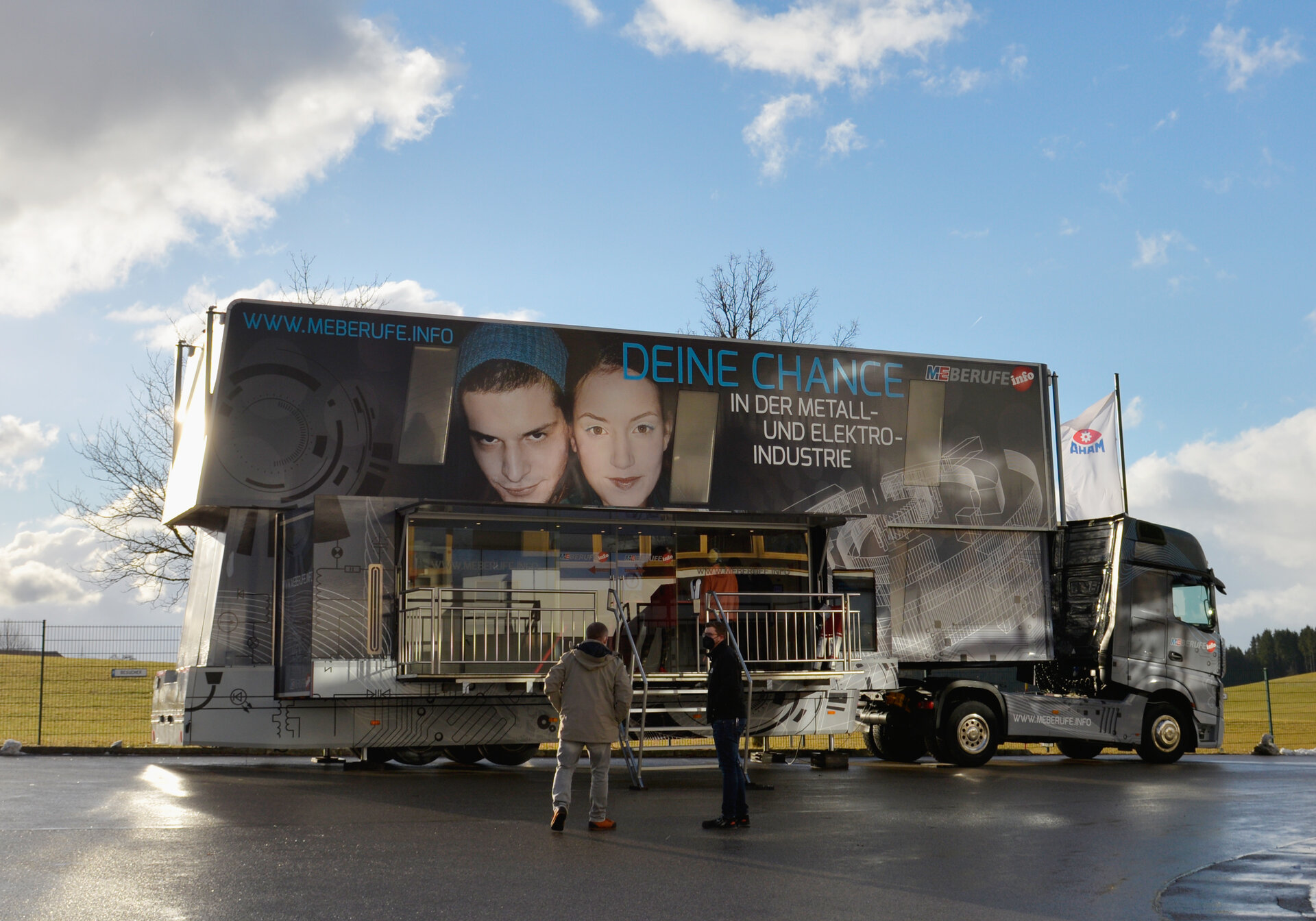 Haldenwang, 24th February 2022. The choice of apprenticeships is almost inexhaustible. Understandably, many teens in graduating classes are spoiled for choice and wonder: “What do I want to be?”. To help them find a career, the M+E InfoTruck (M+E = metal and electrical) travels through Bavaria under the motto “Fascination of Technology” and informs students in the seventh to tenth grades at secondary schools about training opportunities in the metal and electrical industry. Students from the Kempten and Obergünzburg state secondary schools and the Altusried, Dietmannsried, Hofmühle Kempten and Durach secondary schools took advantage of this opportunity. They were invited to explore the InfoTruck and also the MAHA company.