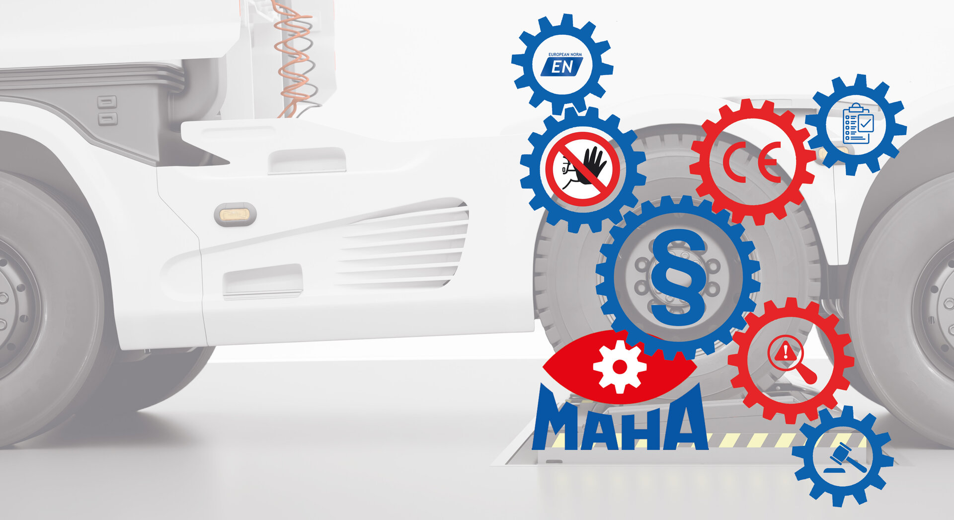 In addition to EN 17003, MAHA consistently ensures compliance with other harmonised standards such as EN 1493 (Vehicle lifts), EN ISO 13849-1 (Safety-related parts of control systems) and EN 60204-1 (Safety of machinery – electrical equipment of machines).