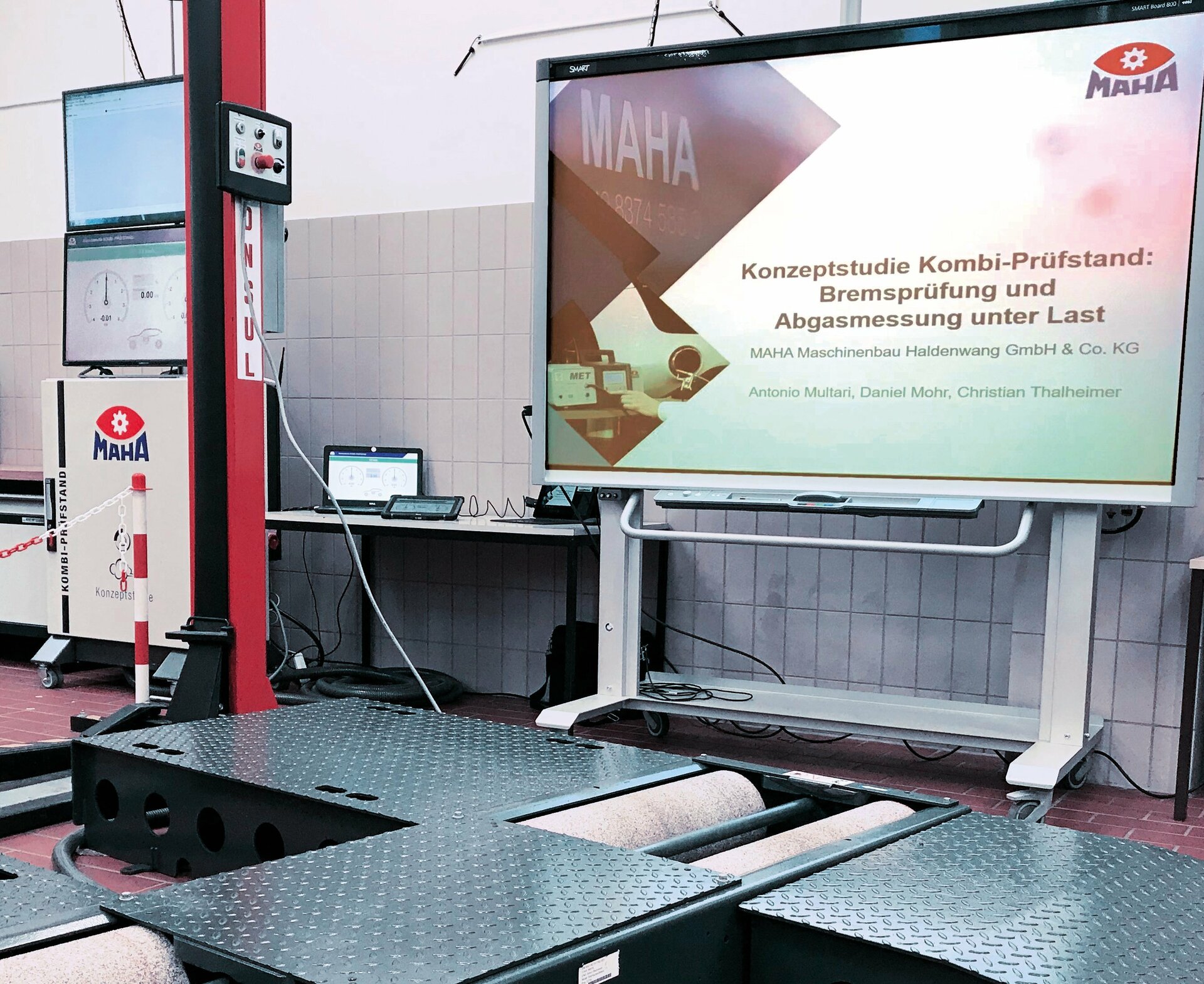 Chez MAHA, on a non seulement réfléchi à une méthode de mesure du NOx sous charge envisageable pour l’avenir, mais on a également poussé plus loin la réflexion et réfléchi au côté pratique : en intégrant la mesure des gaz d’échappement à un banc de contrôle des freins, qui a fait ses preuves, la nouvelle méthode pourrait être mise en œuvre sans complications pour les ateliers et sans la nécessité d’investir dans un banc à rouleaux supplémentaire pour contrôler les gaz d’échappement.