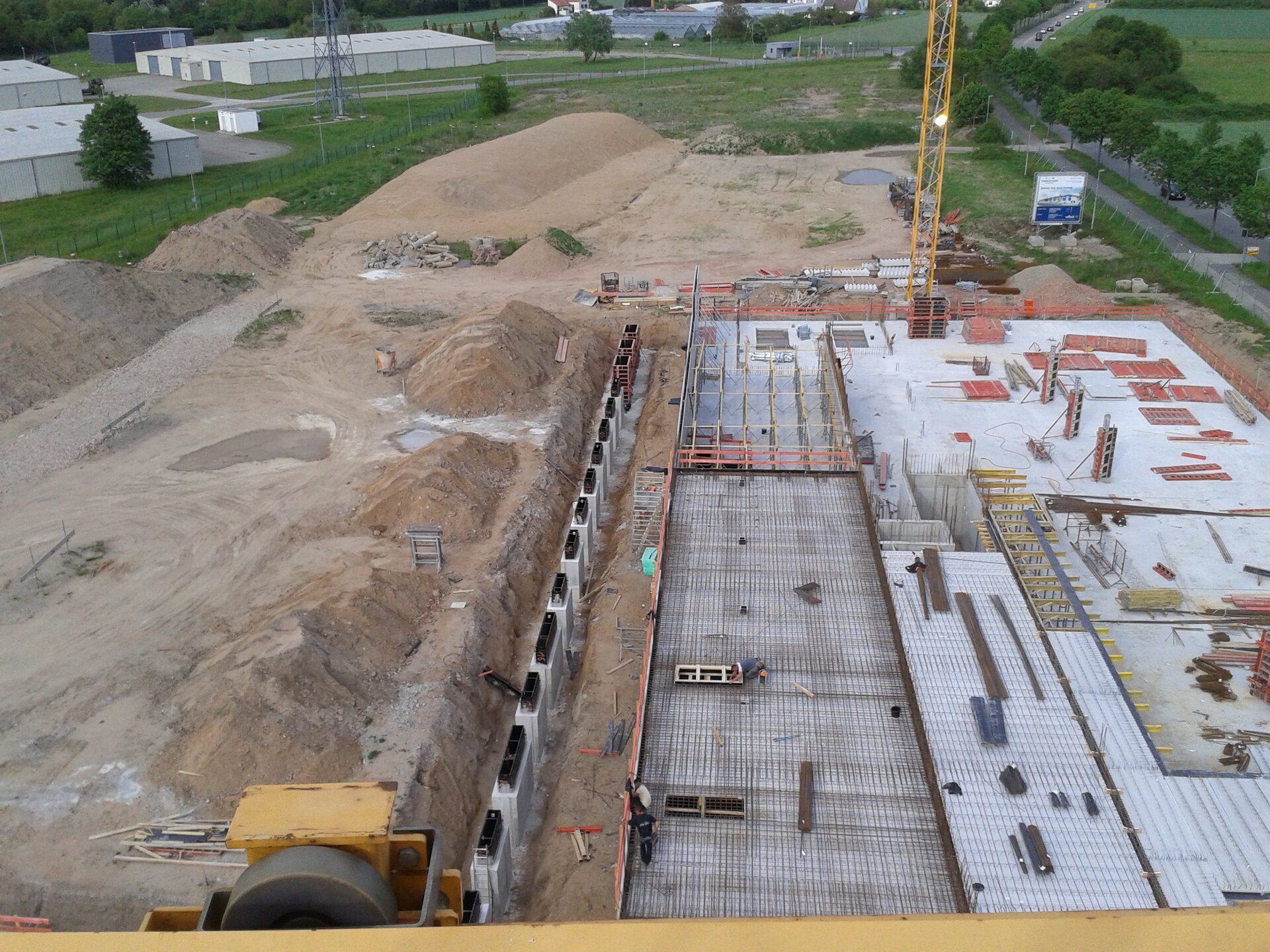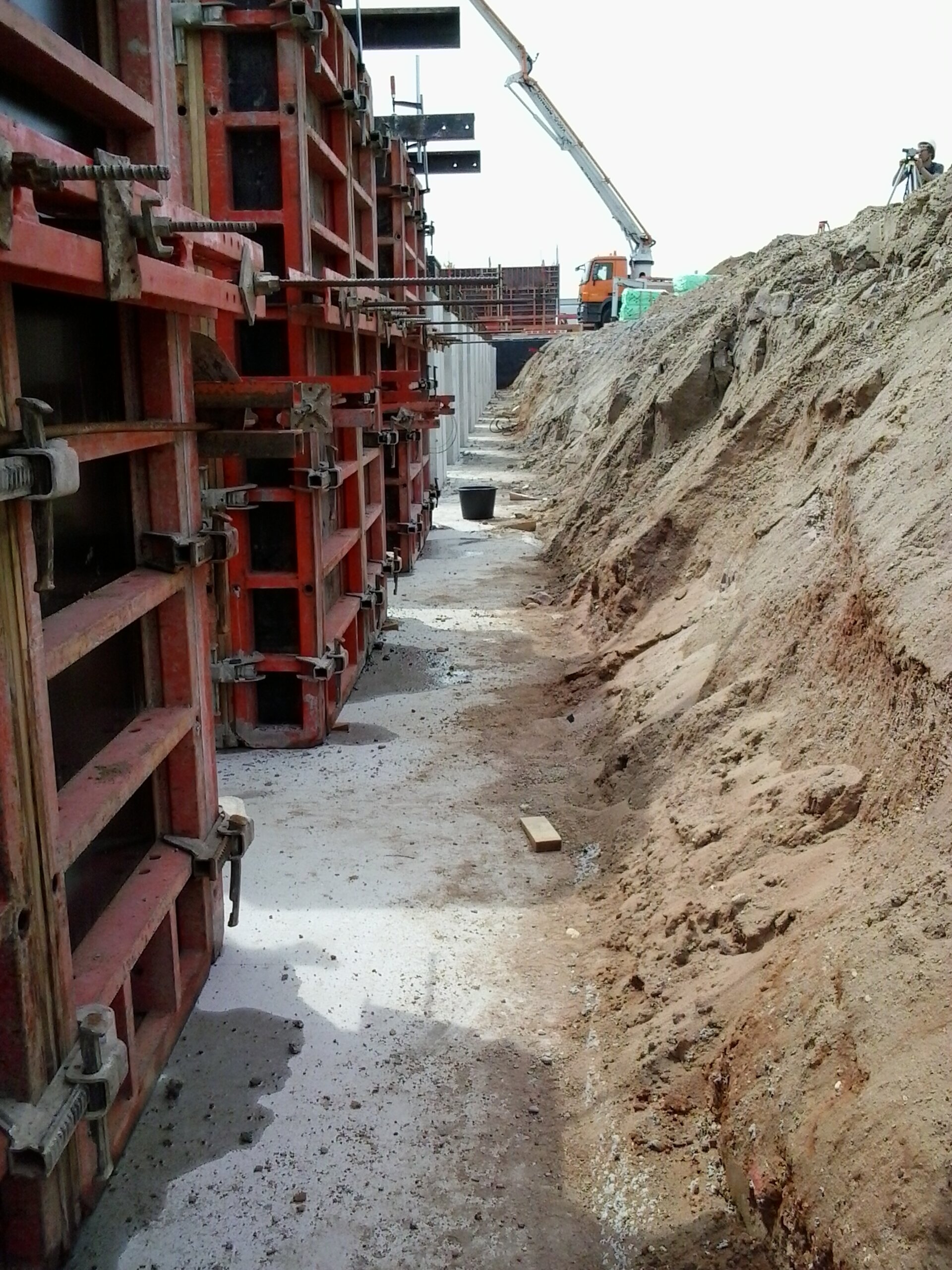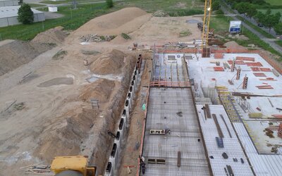 Le positionnement a ensuite été effectué au millimètre près grâce à l’aide d'un géomètre et les semelles bétonnées au fur et à mesure. Ce sont en tout 26 cassettes qui ont été positionnées de manière exacte et à la bonne hauteur de cette façon. Une fois les semelles en place, les fondements ont pu, pour finir, être comblés avec du sable, et l’atelier construit autour des cassettes.